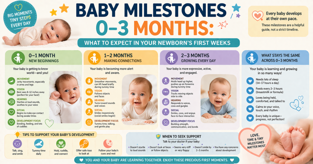 The first three months of life are extraordinary. In just twelve weeks, a newborn transforms from a creature of pure reflex and survival instinct into a social, curious little person who smiles, coos, and tracks your face across the room. Understanding 0–3 month baby milestones can help you know what to look for, what to celebrate, and when it might be worth checking in with a professional.