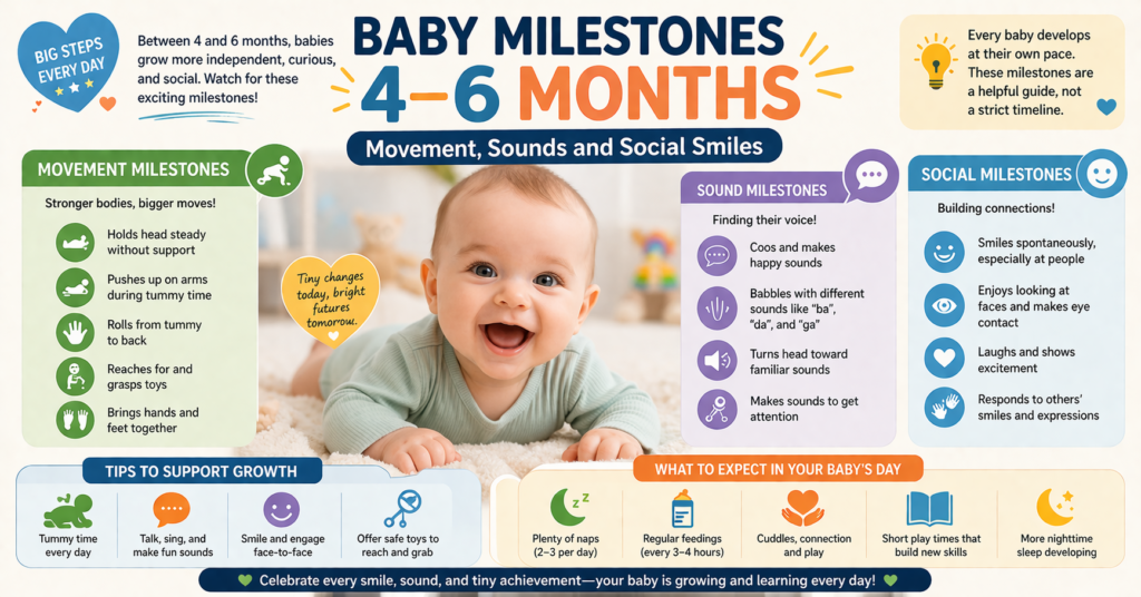 Four to six months is when many parents feel like their baby truly “arrives” as a social being. The smiles, laughs, and expressive faces of this stage are among the most memorable moments of early parenthood.