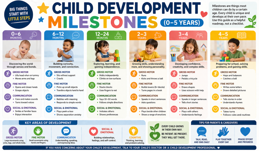 The following sections walk through each major age band from birth to five years. Each section covers the five key developmental areas, red flags that may suggest a child would benefit from professional support, and a brief note on how allied health can help.