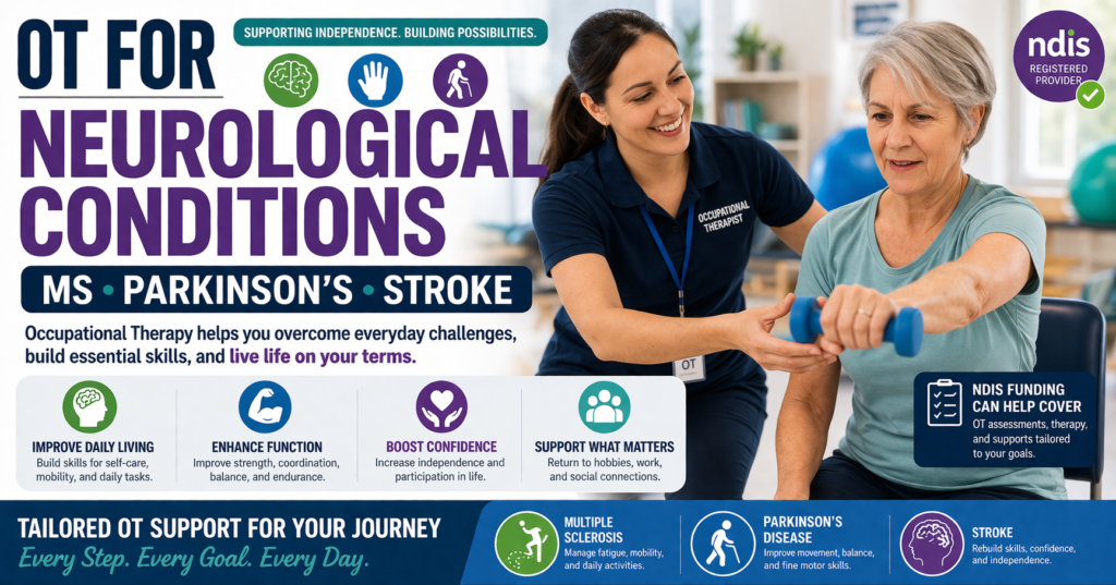 Occupational therapy for neurological conditions addresses the real-world functional consequences of MS, Parkinson’s disease, stroke, spinal cord injury, MND, and other conditions — through fatigue management, daily living skill adaptation, AT prescription, home modification, and clinical reporting that underpins NDIS plan funding. For progressive conditions, the most valuable OT is proactive: anticipating future needs, planning modifications before they become urgent, and building a longitudinal evidence base that makes plan reviews more effective over time.