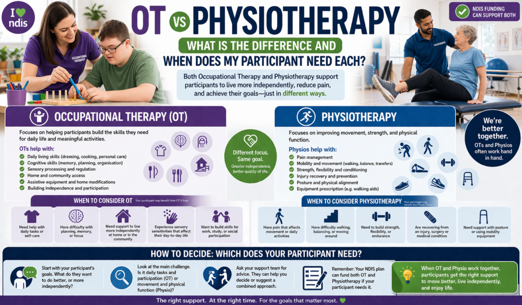 This guide explains the practical difference between OT and physiotherapy for NDIS support coordinators β when each is indicated, where they overlap, and how to determine which should take the lead for a given participant and situation.