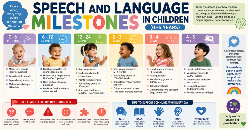 Understanding speech milestones in children is one of the most common reasons parents turn to Dr Google at 2am. If you’ve ever wondered whether your child is talking enough, clearly enough, or at the right time — you’re not alone. Speech and language development varies widely between children, and knowing what to look for at each age can help you feel more confident and act early if support is needed.